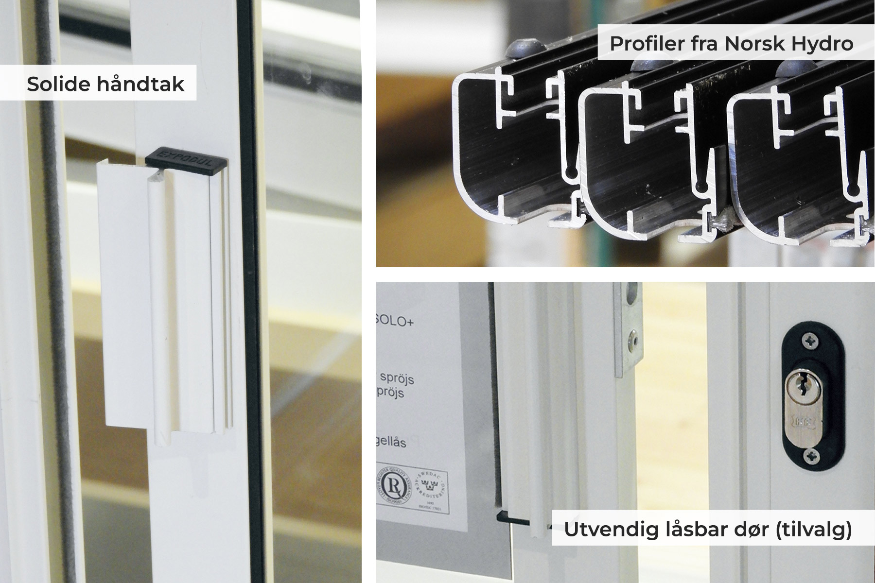 Skyvedørene kan velges i hvit bomull eller sort matt profil. Profilene er i aluminium og leveres med hele 10 års lakk-garanti.
