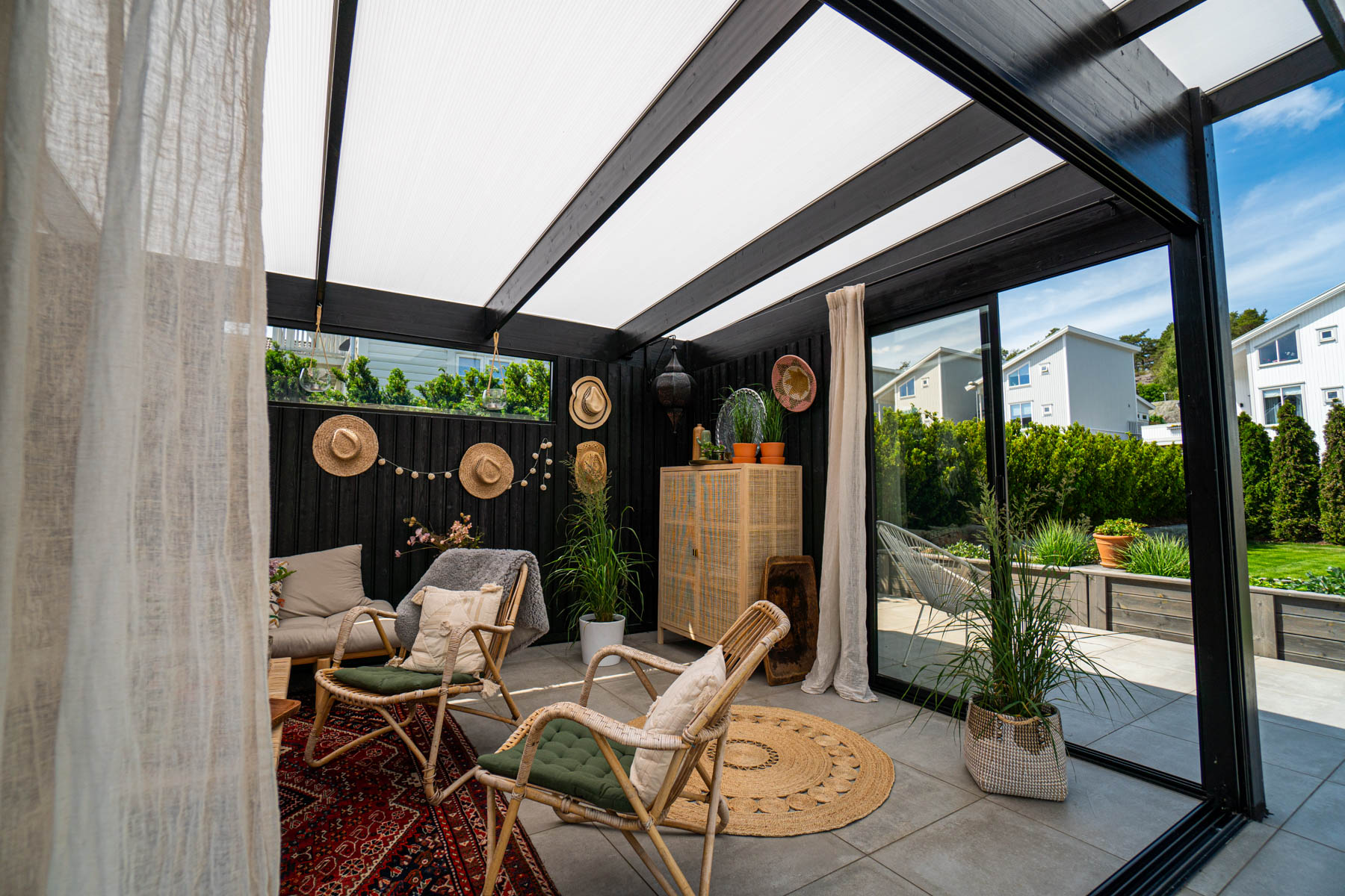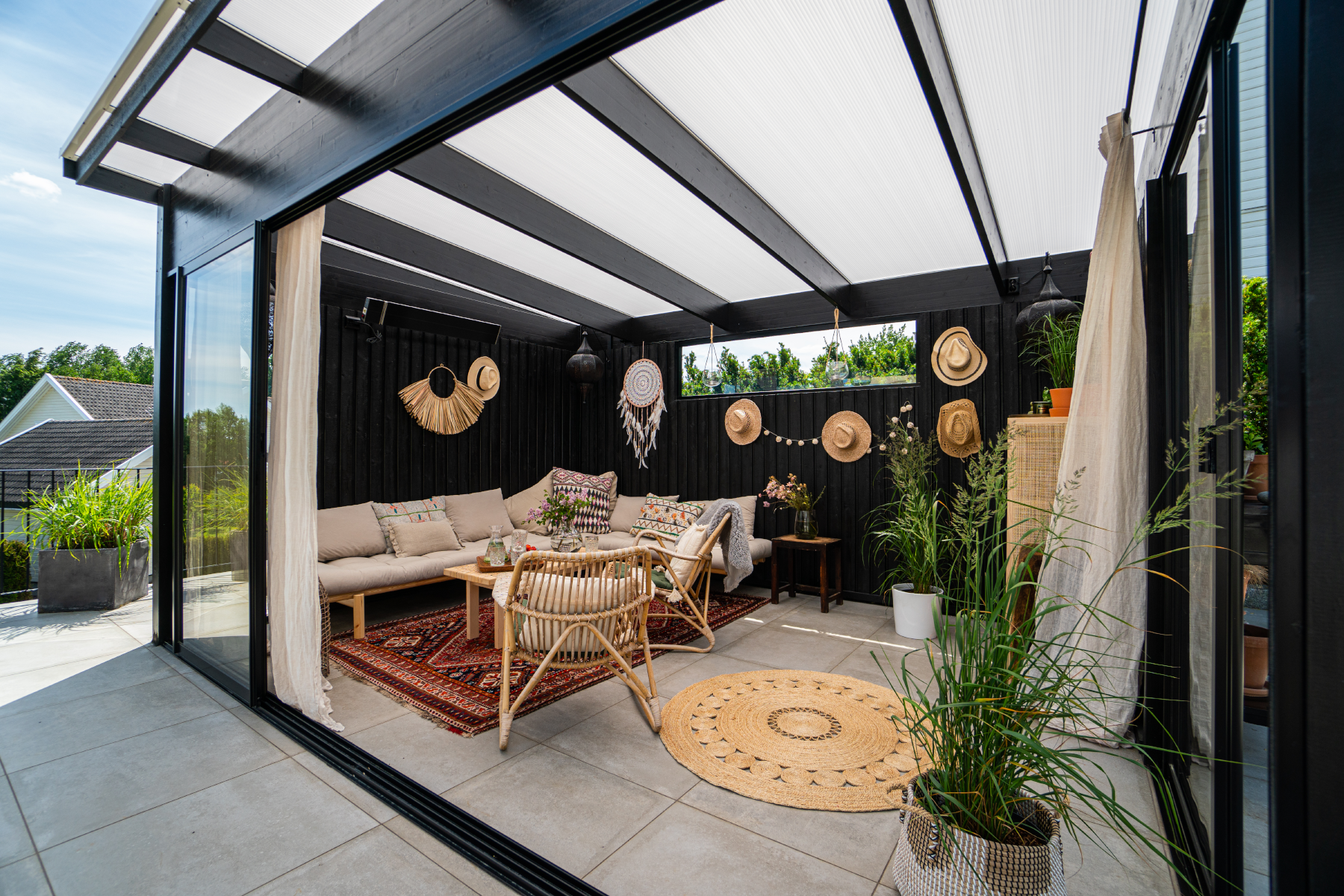 Det moderne profilsystemet kombinerer skum-PVC på innsiden av taket og aluminium på utsiden, noe som gir et pent, vedlikeholdsvennlig og holdbart tak med god isolering mot sol og varme.