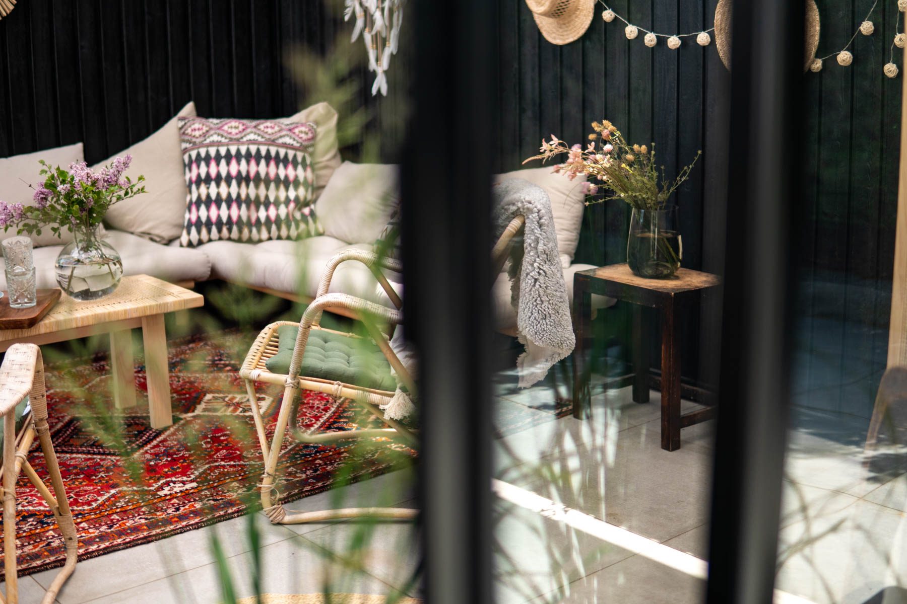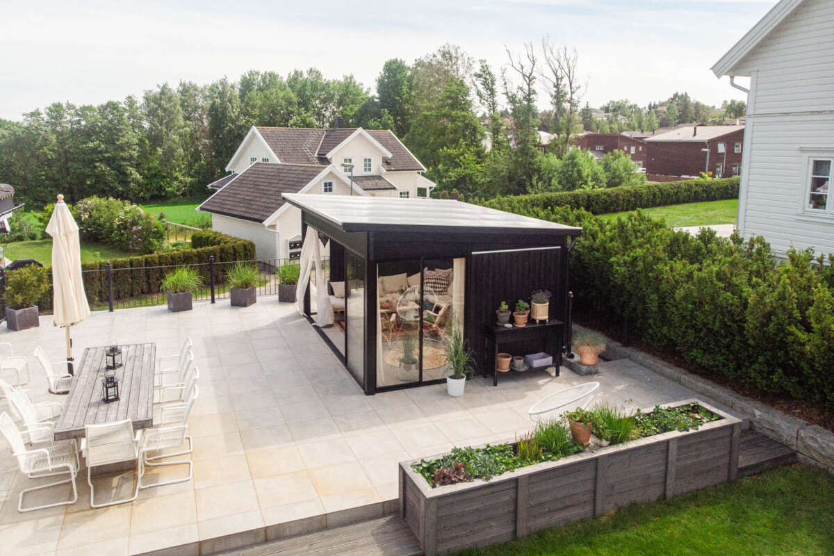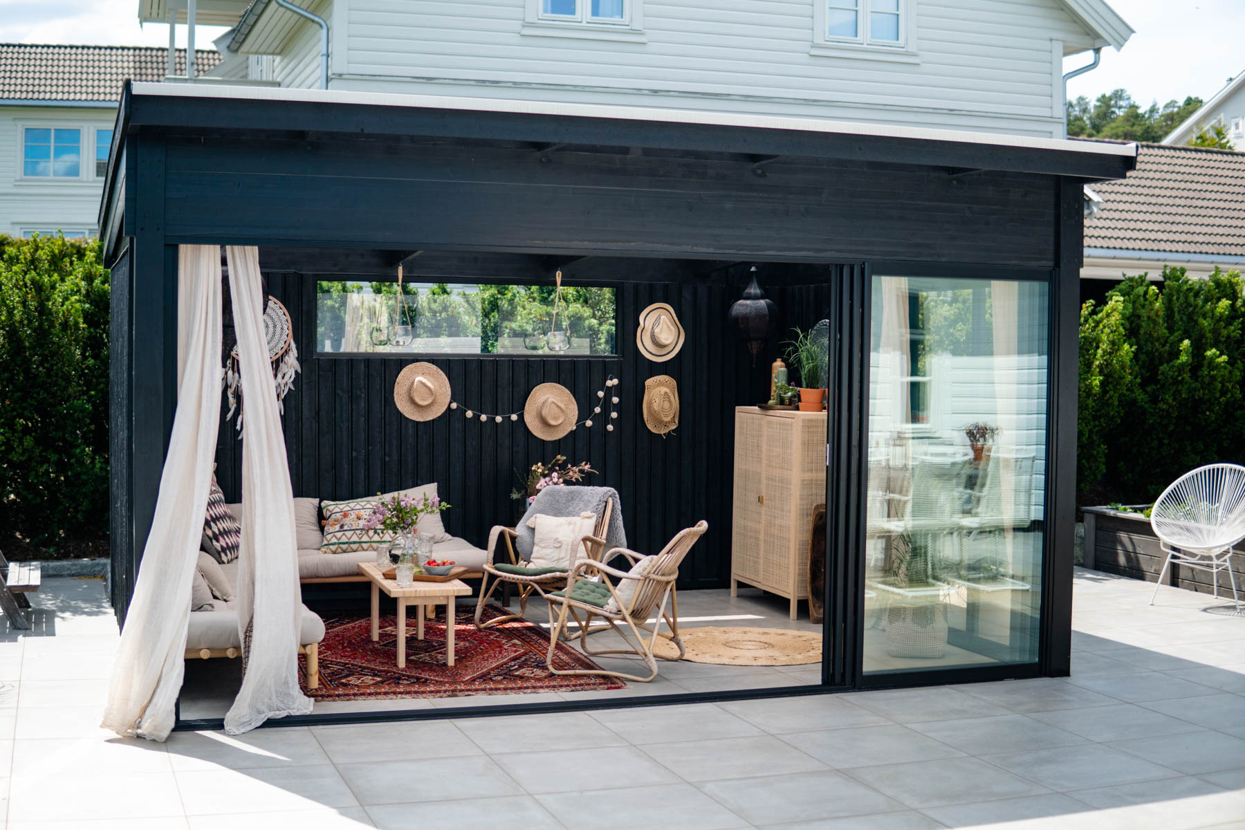 Norgesstua | Frittstående uisolert hagestue Hankø 14.9 m² fra Norgesstua med store skyvedører og faste glassfelt, innredet som en moderne uteplass i norsk hage.